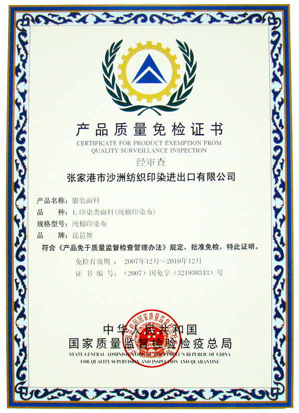 Certificate For Product Exemption From Quality Surveillance Inspection
